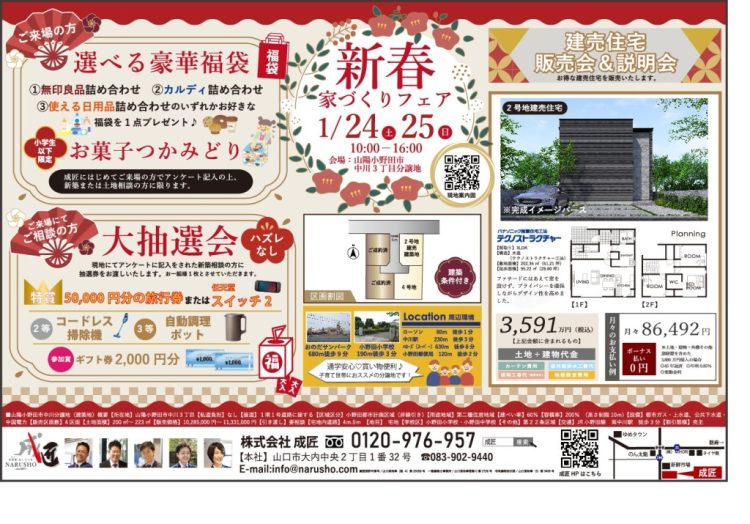 今年も毎年恒例の新春イベントととして「新春家づくりフェア」を山陽小野田市中川3丁目分譲地にて開催いたします。