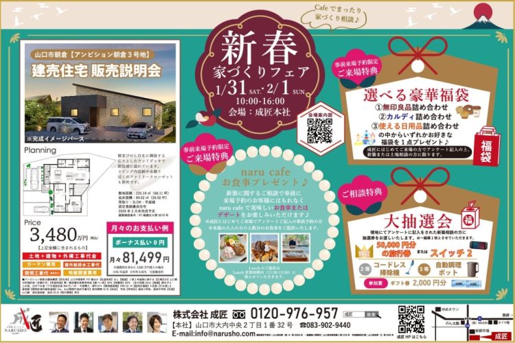 今年も毎年恒例の新春イベントとして「新春家づくりフェア」を㈱成匠本社(山口市大内中央2-1-32)にて開催いたします。